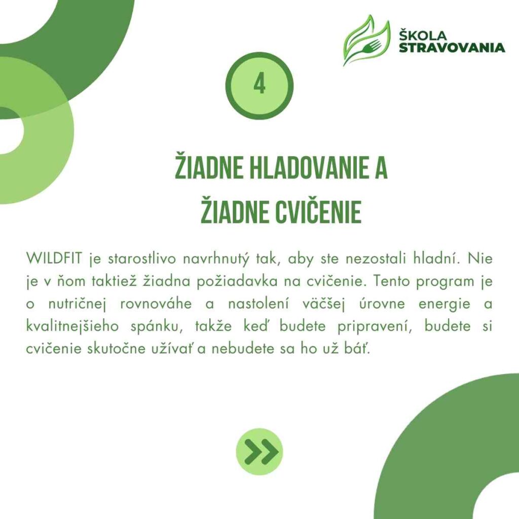 WILDFIT je starostlivo navrhnutý tak, aby ste nezostali hladní. Nie je v ňom taktiež žiadna požiadavka na cvičenie. Tento program je o nutričnej rovnováhe a nastolení väčšej úrovne energie a kvalitnejšieho spánku, takže keď budete pripravení, budete si cvičenie skutočne užívať a nebudete sa ho už báť.