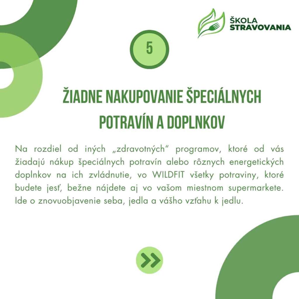 Na rozdiel od iných „zdravotných“ programov, ktoré od vás žiadajú nákup špeciálnych potravín alebo rôznych energetických doplnkov na ich zvládnutie, vo WILDFIT všetky potraviny, ktoré budete jesť, bežne nájdete aj vo vašom miestnom supermarkete. Ide o znovuobjavenie seba, jedla a vášho vzťahu k jedlu.