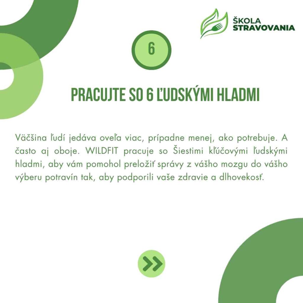 Väčšina ľudí jedáva oveľa viac, prípadne menej, ako potrebuje. A často aj oboje. WILDFIT pracuje so Šiestimi kľúčovými ľudskými hladmi, aby vám pomohol preložiť správy z vášho mozgu do vášho výberu potravín tak, aby podporili vaše zdravie a dlhovekosť.