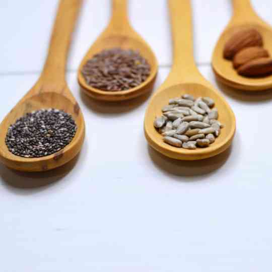 1. Ľanové semienka (90 g) – sú bohaté na omega-3 mastné kyseliny, ktoré podporujú zdravie srdca. Obsahujú aj vysoké množstvo vlákniny, čo zlepšuje trávenie a pomáha udržiavať stabilnú hladinu cukru v krvi.
