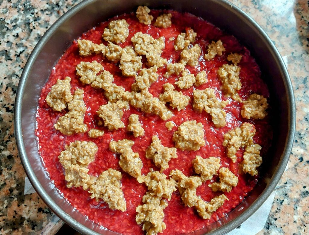 Po upečení cesta ovocie vylejte do formy a vrch zasypte zvyškami vločiek. Pečte znovu asi 20 minút. Po upečení nechajte vychladnúť, kým sa pustíte do krájania. 👌