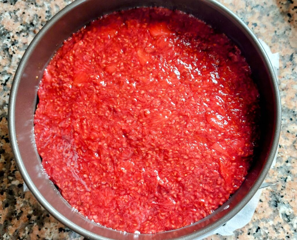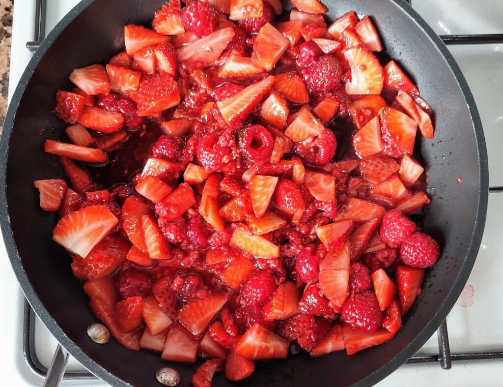 Kým sa pečie pripravte ovocnú náplň. 🍓 Mrazené ovocie podlejte vodou 💦 a nechajte zohrievať, kým sa roztopí. Keď sa ovocie rozvarí, pridajte citrónovú šťavu 🍋 a dochuťte ho cukrom podľa potreby. Keď zmes začne hustnúť, tak je pripravená. Ak je ovocie príliš tekuté, preceďte ho cez sitko a tekutinu využijete inak. 💧